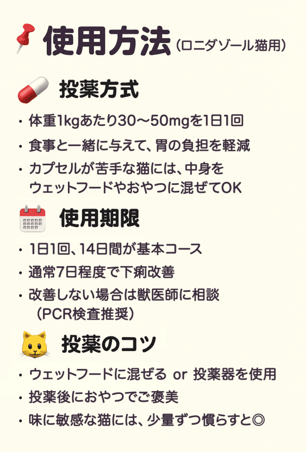 重要なお知らせ:ロニダゾールはトリコモナス感染による下痢症状に有効ですが、すべての病例を治療できるわけではありません。持続的な下痢、食欲不振、その他の不調が見られる場合は、すぐに獣医師に相談してください。健康は小さなことでも大切で、獣医師の診断と指導が愛猫の幸せを守る鍵です。