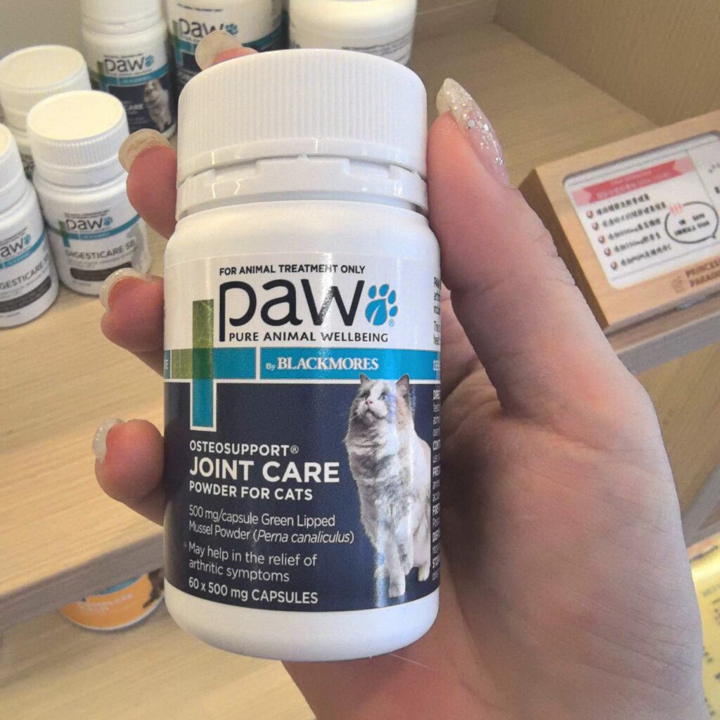 - 猫用(カプセルタイプ):60カプセル(1カプセル500mg)、すべての体型の猫に適し、1日1カプセルで約2カ月分。詳細:猫用オステオサポート。