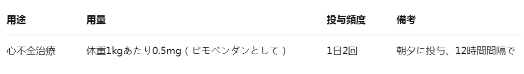 - 僧帽弁閉鎖不全症:1日2回投与で心臓のポンプ機能を強化。咳や呼吸困難を軽減。