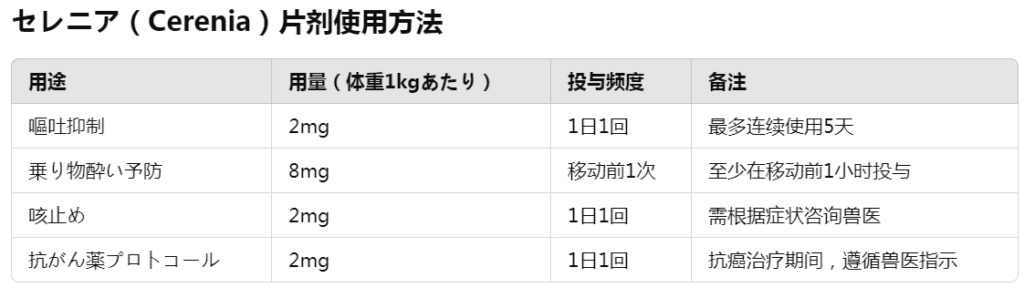 - 急性嘔吐:1日1回投与で嘔吐を迅速に抑制。症状が続く場合は獣医師に相談。