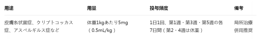 - クリプトコッカス症:3サイクル投与で呼吸器系や中枢神経系の感染を管理、必要に応じて獣医師が追加サイクルを指示。
