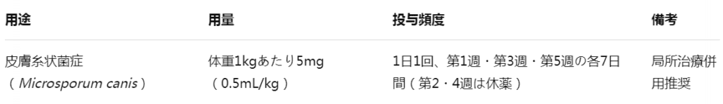 - 皮膚糸状菌症:3サイクル(第1週、第3週、第5週、各7日間)投与でMicrosporum canisによるリングワームを治療、皮膚のかゆみや脱毛を改善。