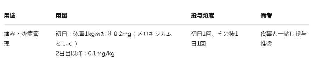 - 変形性関節症:初日0.2mg/kg、以降0.1mg/kgを1日1回投与で関節の痛みと炎症を軽減。