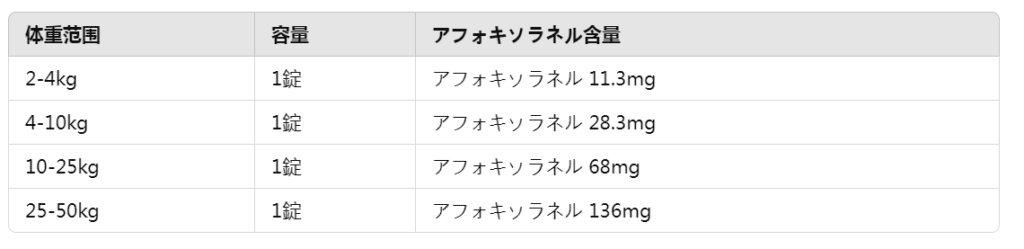 ※50kg以上の犬には、体重に応じた組み合わせを使用(例:50-75kgの場合は136mg錠+68mg錠)。