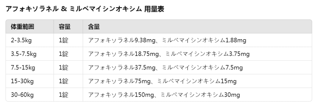 - フィラリア(Dirofilaria immitis):月1回使用で予防。初回使用前にフィラリア検査を行い、感染がないことを確認してください。