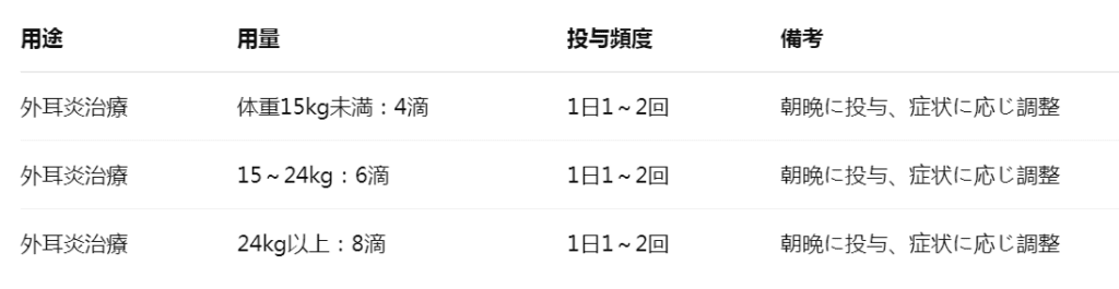- 外耳炎:1日2回投与で細菌や真菌による炎症を抑制。耳の清潔を保つ。