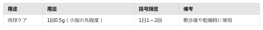 - 肉球の乾燥:1日1~2回塗布で潤いを補給。ひび割れを予防。
