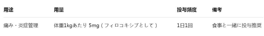 - 慢性疼痛:1日1回投与で長期的な痛みコントロール。獣医師の定期モニタリングが必要。