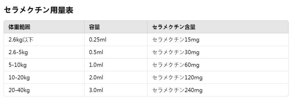 - フィラリア(Dirofilaria immitis):月1回使用し、幼虫が成虫になるのを予防します。初回使用前にフィラリア検査を行い、成虫感染がないことを確認してください。