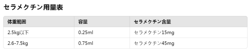 - 消化管線虫(回虫など):1回使用で駆除、予防には毎月継続。