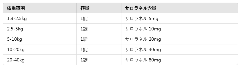 ※40kg以上の犬には、体重に応じた組み合わせを使用(例:40-60kgの場合は80mg錠+40mg錠)。