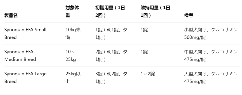 - 関節炎予防:1日1回投与で関節の摩耗を予防。特に大型犬や活動的な犬に推奨。