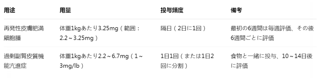 - 下垂体依存性クッシング症候群:1日1回(または2回)投与でコルチゾール生成を抑制し、多飲多尿、過食、脱毛を軽減。