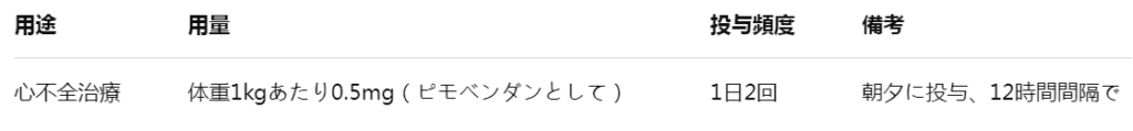 - 僧帽弁閉鎖不全症:1日2回投与で心臓のポンプ機能を強化。咳や疲労を軽減。